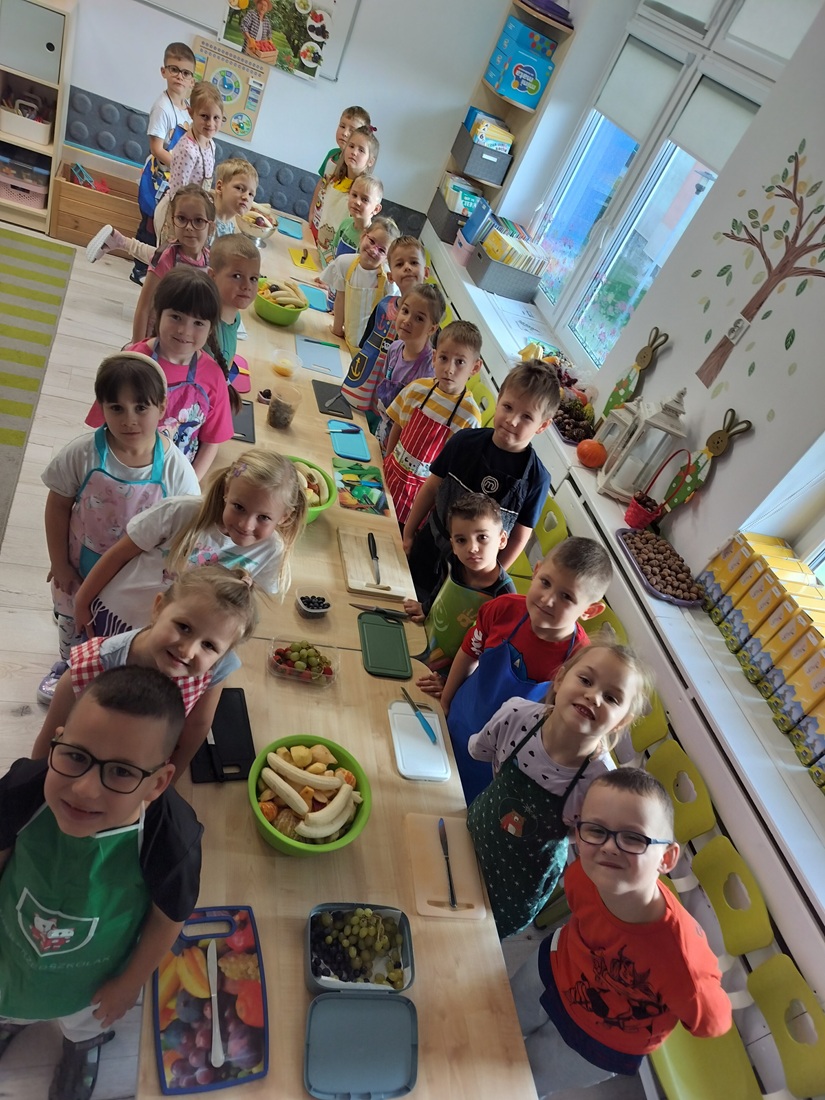 W tym tygodniu grupa fioletowa bawi się i uczy w krainie zdrowia. Nie mogło więc zabraknąć pysznej sałatki owocowej własnej produkcji. Można było tam znaleźć wszystkie owoce dostępne jesienią . A sałatka wyszła nam przepysznie!