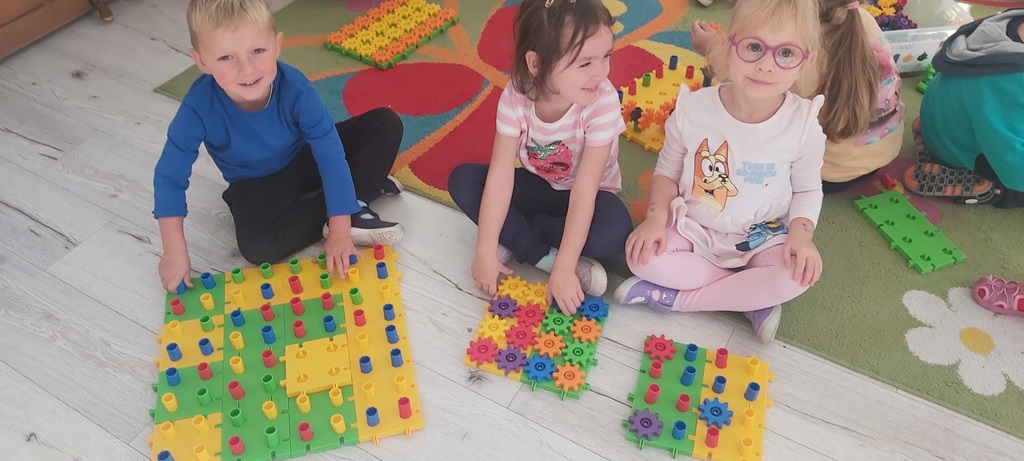 Grupa Czerwona budowała kwadraty zespołowo z klocków Korbo. Dzięki klockom Korbo dzieci mogą rozwijać swoje umiejętności analityczne i interdyscyplinarne.