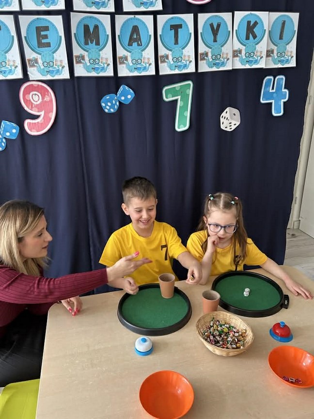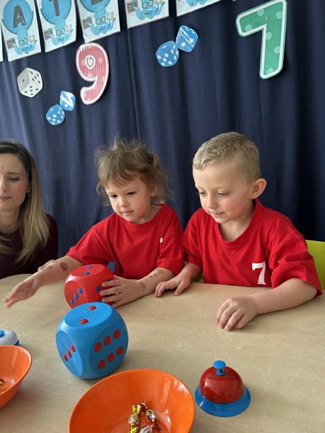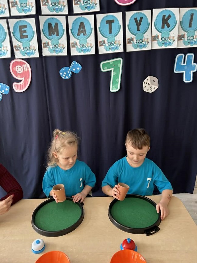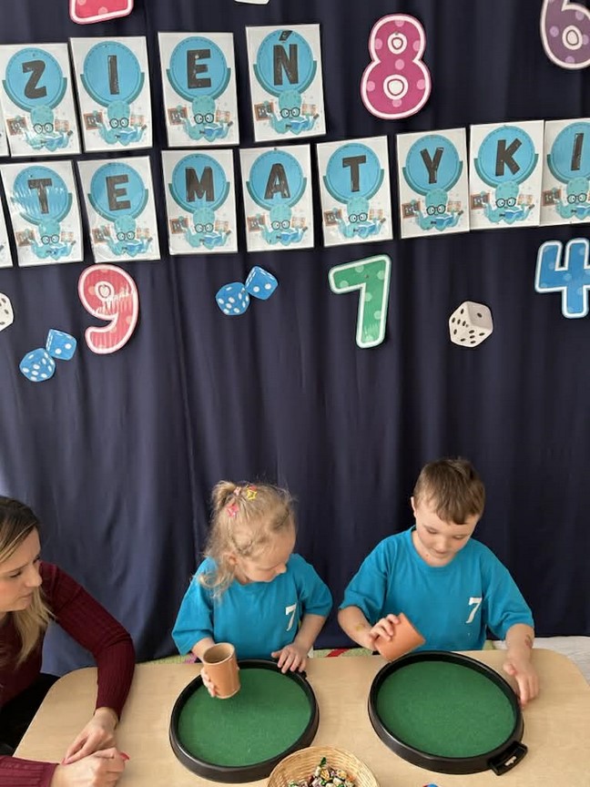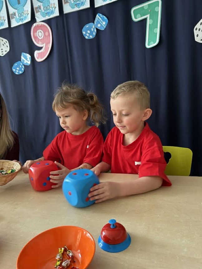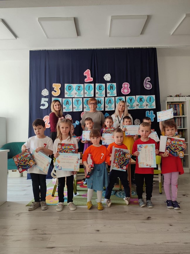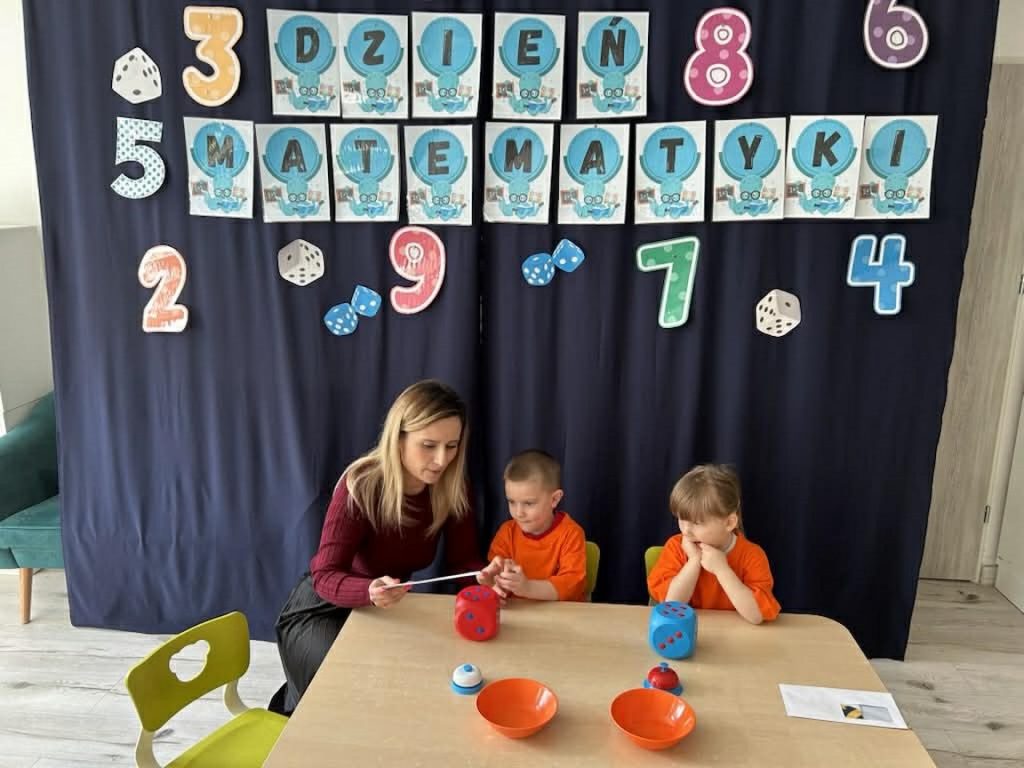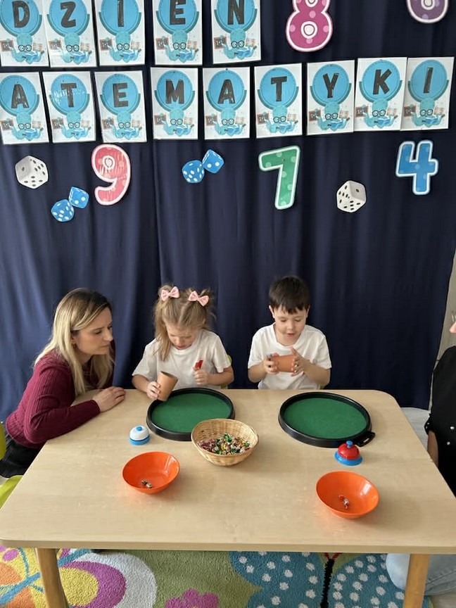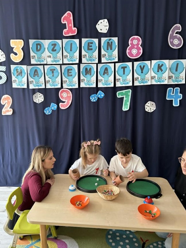 Dziś w naszym przedszkolu obchodziliśmy Dzień Matematyki. Z tej okazji odbył się konkurs matematyczny, w którym wzięli udział przedstawiciele każdej grupy. Dzieci bawiły się, dodając oczka na kostkach, a radość i zaangażowanie towarzyszyły wszystkim uczestnikom.