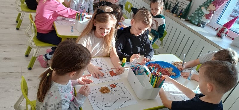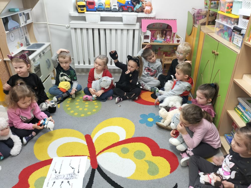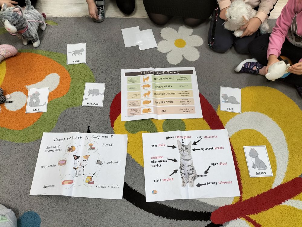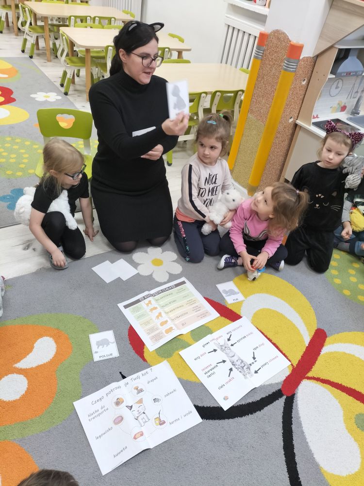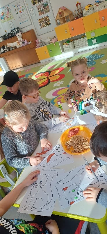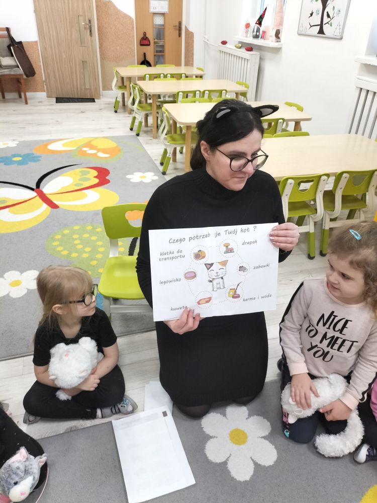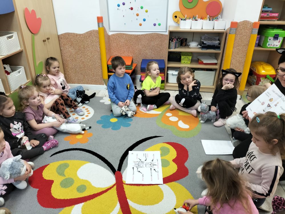 Rozmawialiśmy o kotach – dzieci poznały ciekawostki na temat ich wyglądu, zwyczajów oraz sposobu dbania o zwierzęta domowe. Dowiedziały się, co jedzą koty, jak się nimi opiekować oraz jak ważna jest odpowiedzialność za pupila.