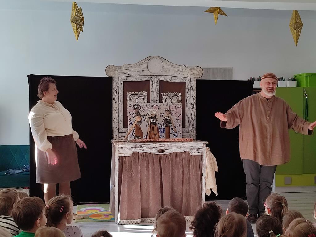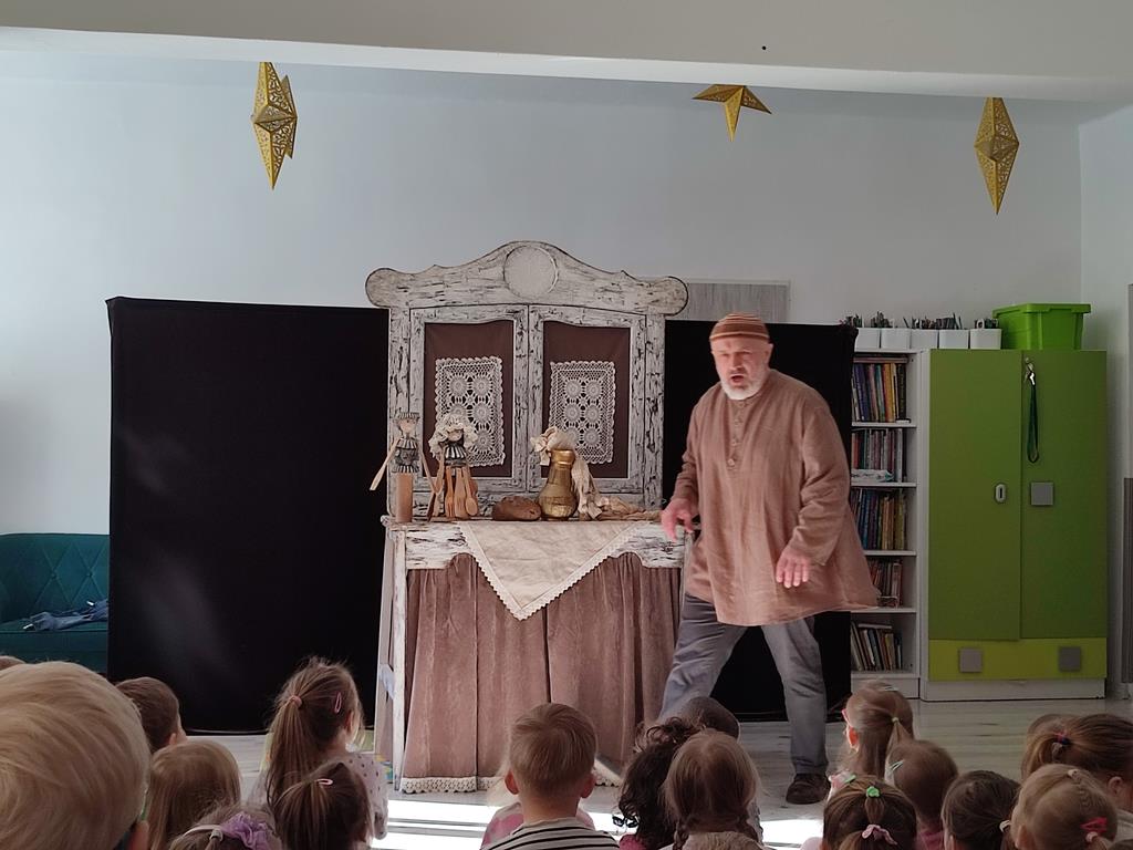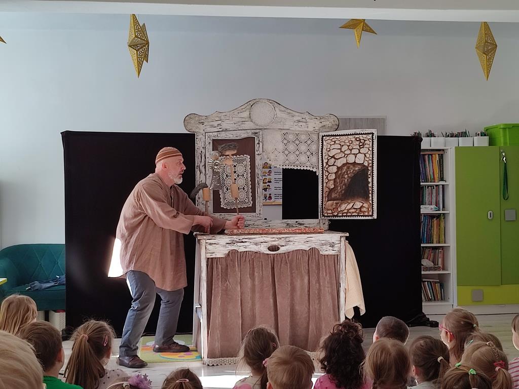 W naszym przedszkolu odbyło się wyjątkowe przedstawienie teatralne pt. „Opowieści starego kredensu”, w wykonaniu Teatru Pod Orzełkiem z Białegostoku. Pan Hilary Szczebrzeszyński wraz z roztargnioną asystentką Anią przeniósł widzów w niezwykły świat wyobraźni, gdzie przedmioty skrywające się w zakamarkach starego mebla ożywały, opowiadając swoje historie.