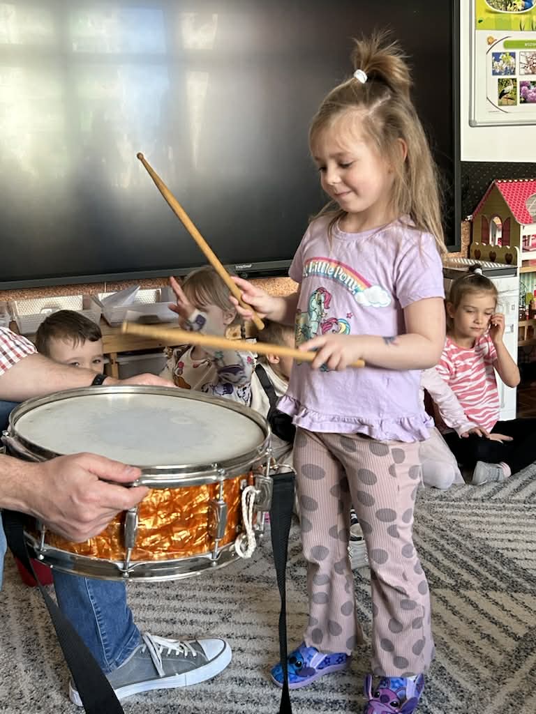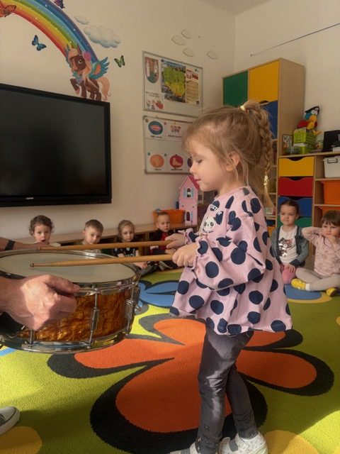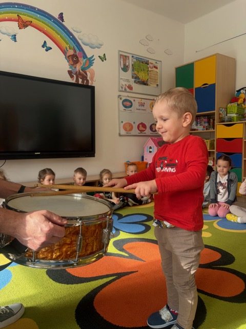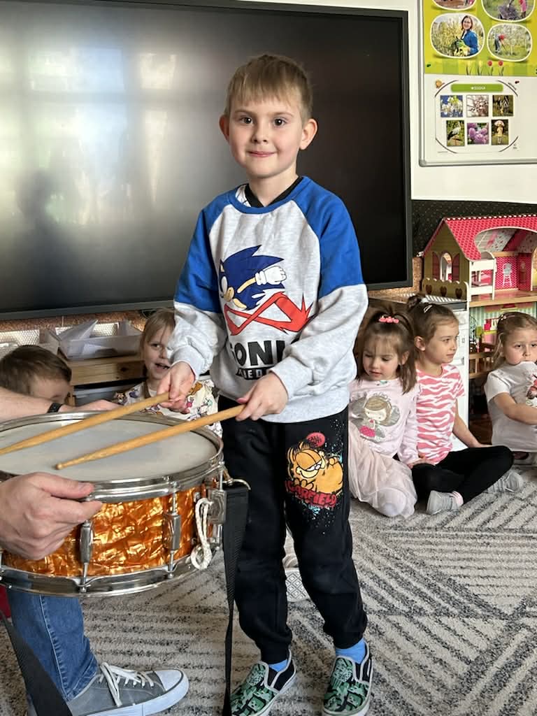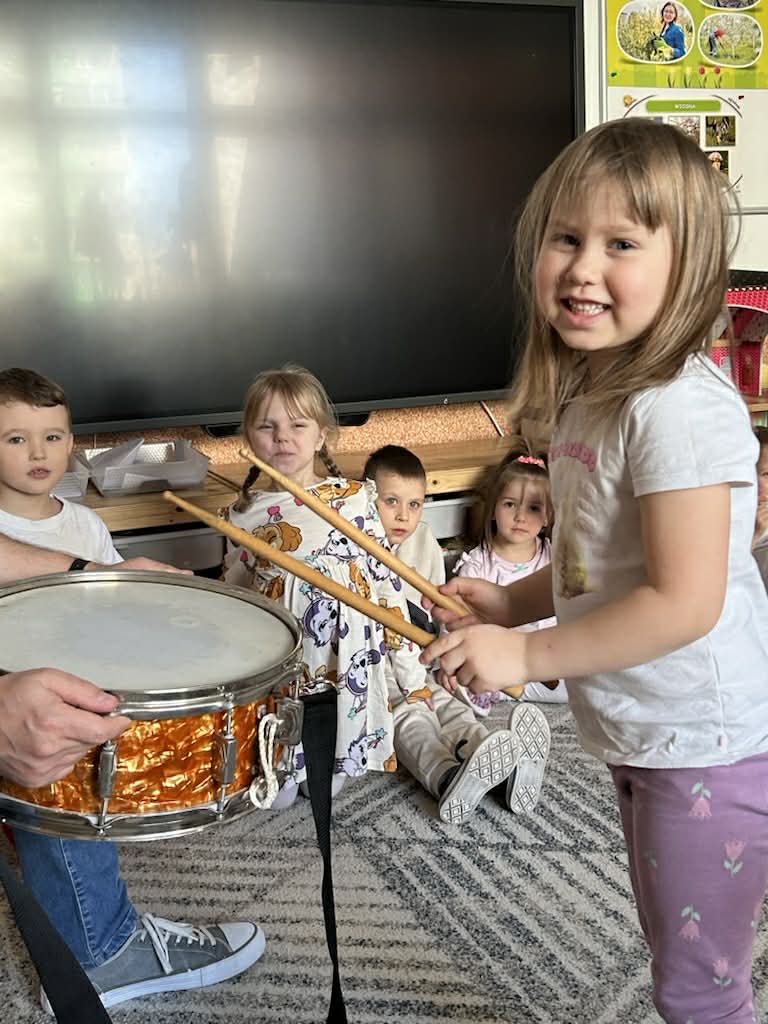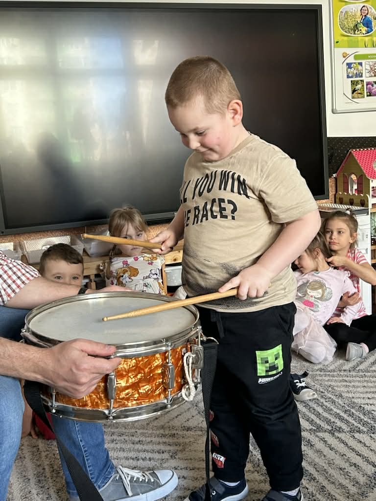 Zajęcia muzyczne 29 marca, 2026 Podczas zajęć muzycznych dzieci poznały nowy instrument perkusyjny – werbel. Przedszkolaki dowiedziały się jak jest zbudowany, w jaki sposób wydobywa się z niego dźwięk oraz gdzie można go usłyszeć.