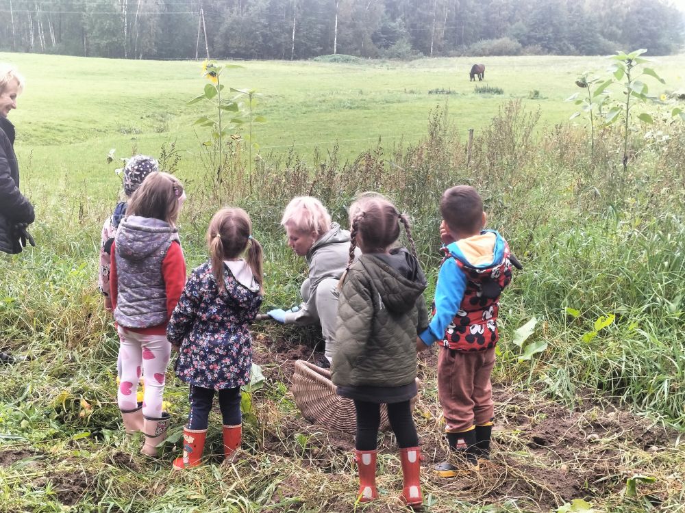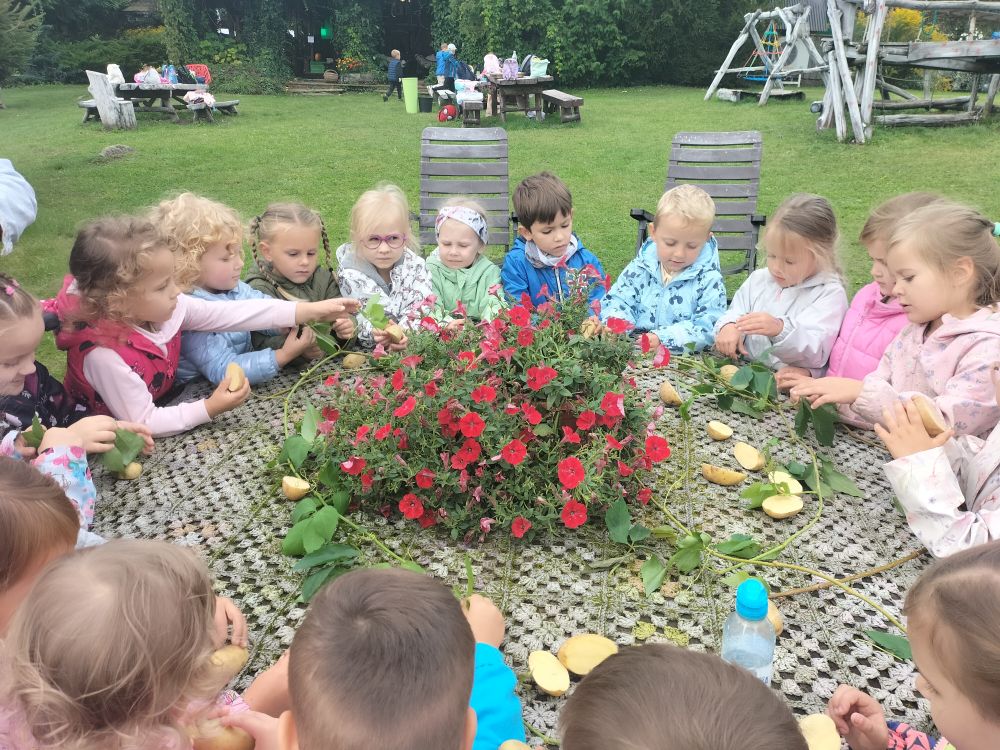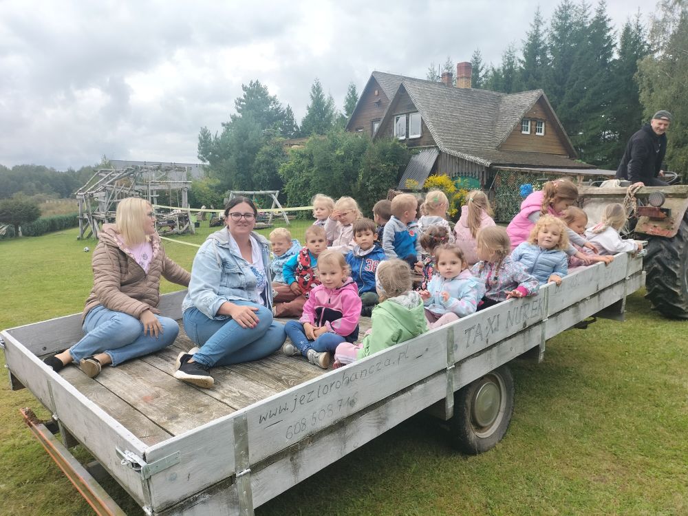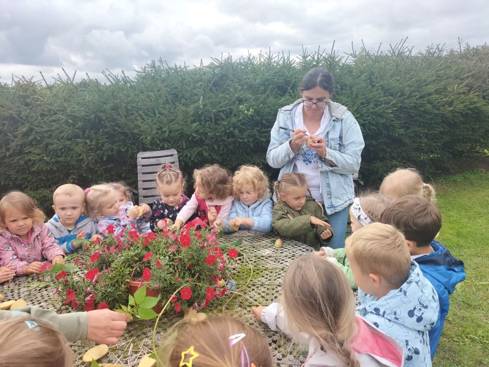 15 września 2025 roku grupy Niebieska i Czerwona wybrały się na pierwszą wycieczkę w tym roku szkolnym. Okazją było Święto Pieczonego Ziemniaka. W gospodarstwie agroturystycznym w miejscowości Mierkinie czekało na przedszkolaków mnóstwo atrakcji. Na pamiątkę spotkania dzieci wykonały ziemniaczanego jeżyka. Nie mogło także zabraknąć ogniska i degustacji pieczonych ziemniaków. Serdeczne podziękowania gospodarzom za dzień pełen wrażeń.