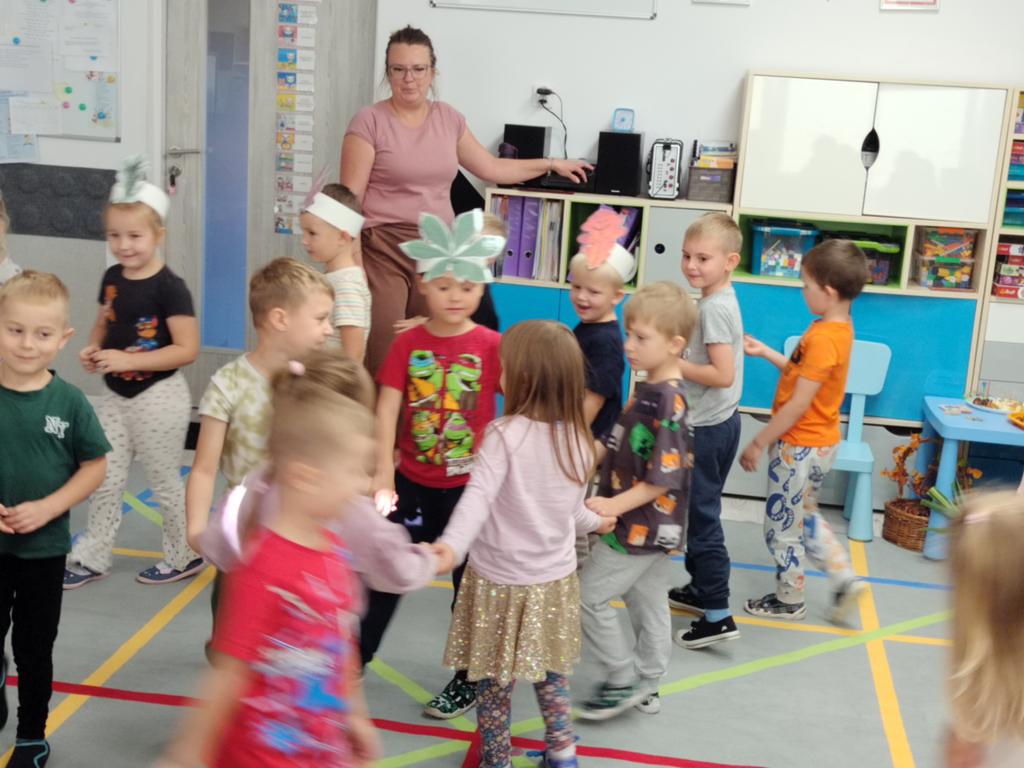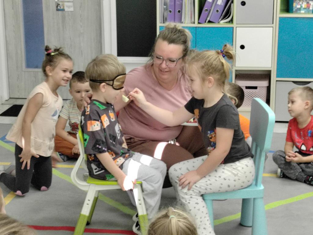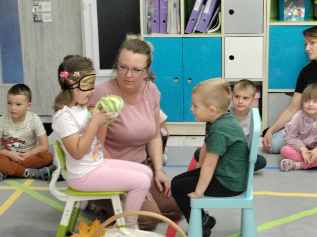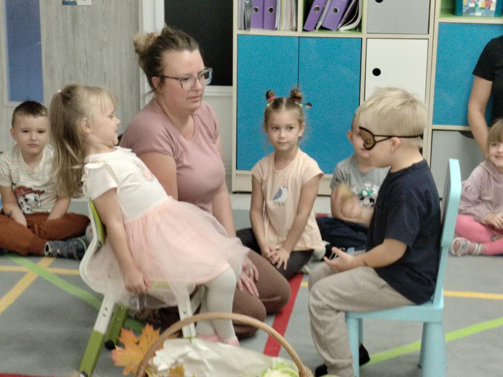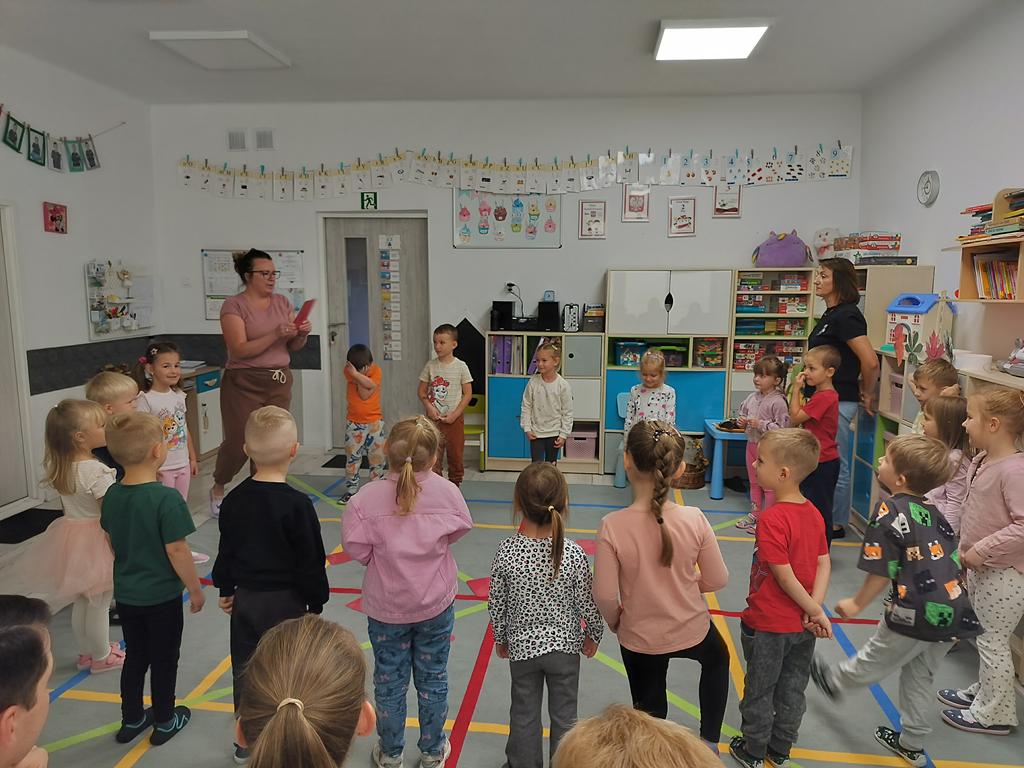 08.10 Grupa Niebieska gościła swoich Rodziców na zajęciach otwartych, na których dzieci pokazały jak pięknie budują wspólne relacje ze sobą i z naturą. Pokazały, jak za pomocą zmysłów poznają otaczający je, jesienny świat. Zajęcia objęły elementy edukacji przyrodniczej, muzycznej, ruchowej, matematycznej. Było też dużo emocji i pokonywania własnych trudności. Dzieci jak zwykle spisały się na medal. Aktywnie i chętnie uczestniczyły w zajęciach.