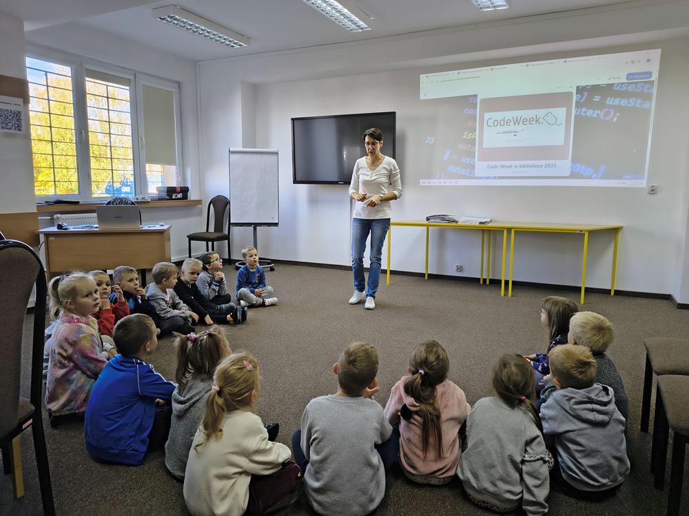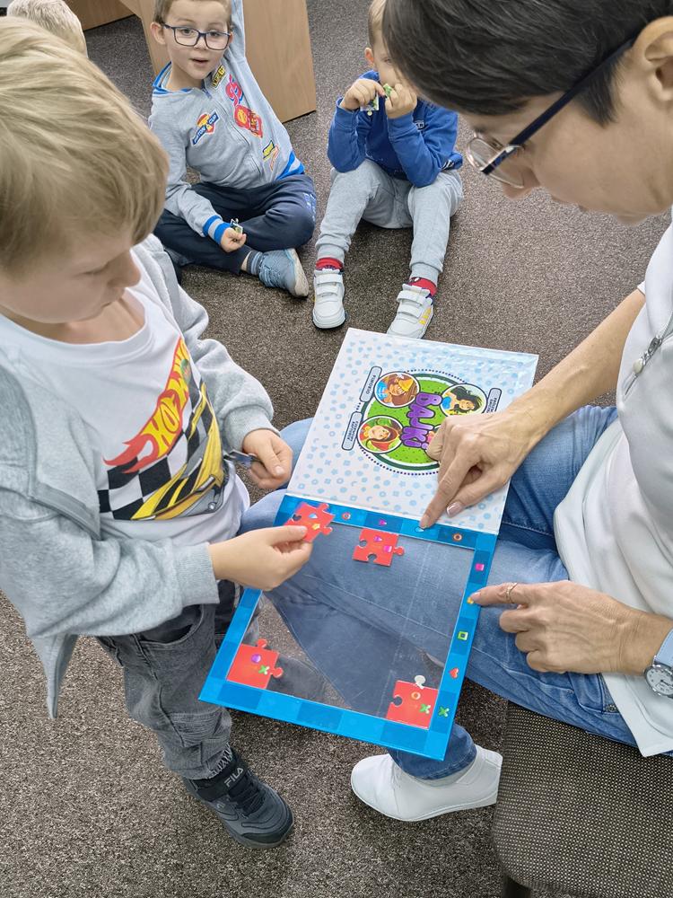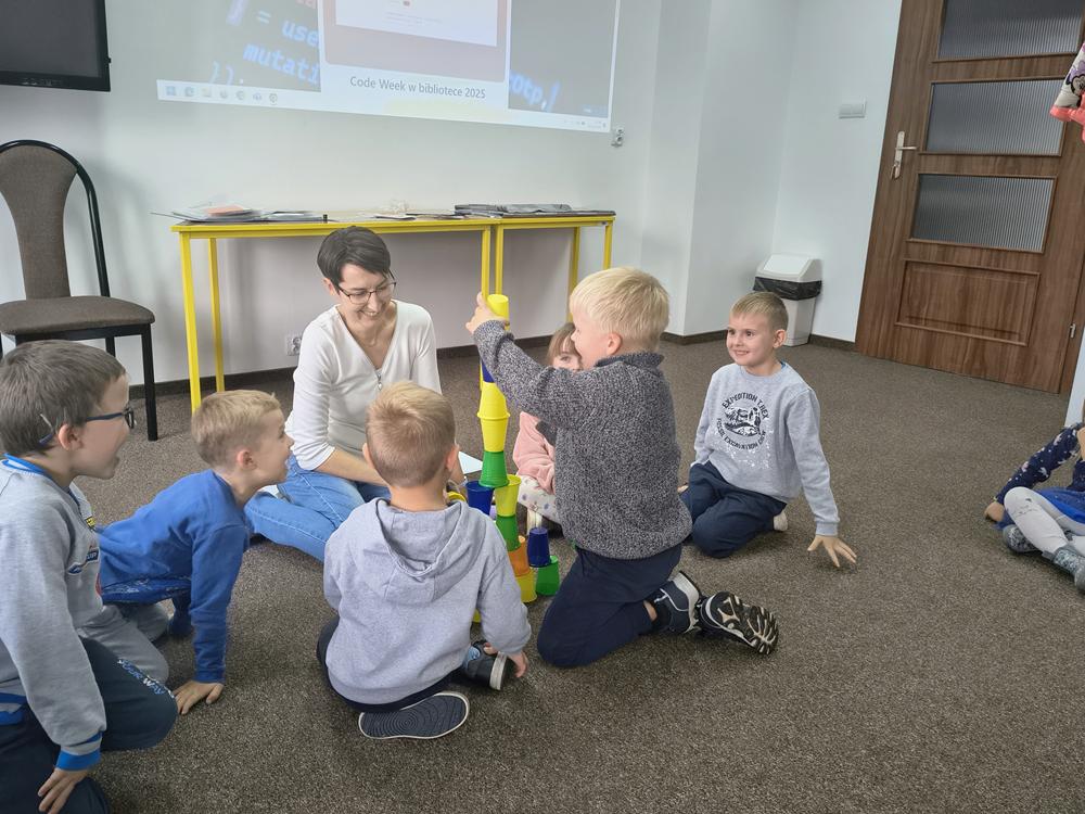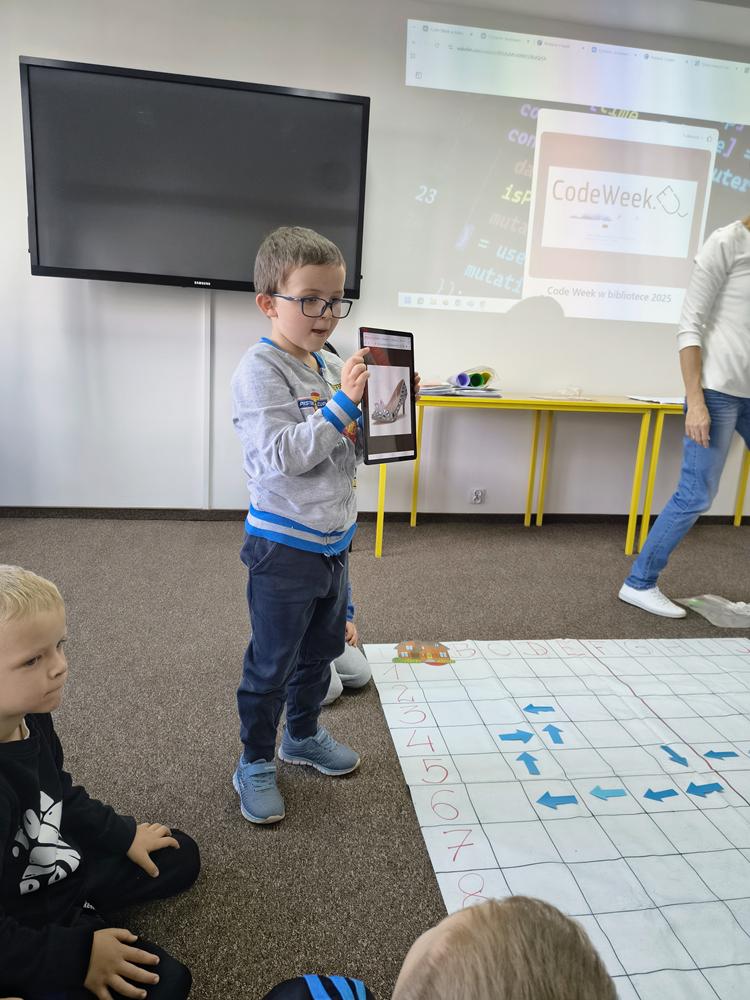 Niebiescy wybrali się do pobliskiej Biblioteki Pedagogicznej, w której właśnie dzisiaj (13.10) rozpoczął się międzynarodowy dwutygodniowy code week, czyli tydzień kodowania. Zajęcia były bardzo ciekawe, kodowanie połączone ze znajomością baśni. Dzieci były bardzo zainteresowane zajęciami i bardzo chętnie wykonywały powierzone im zadania.