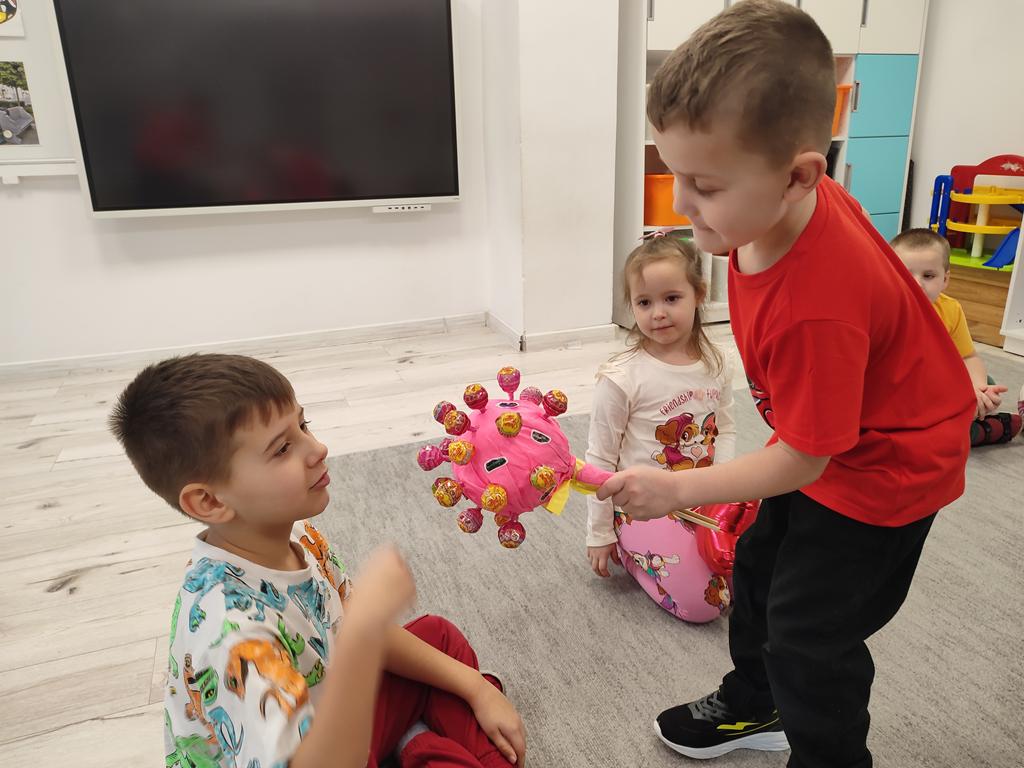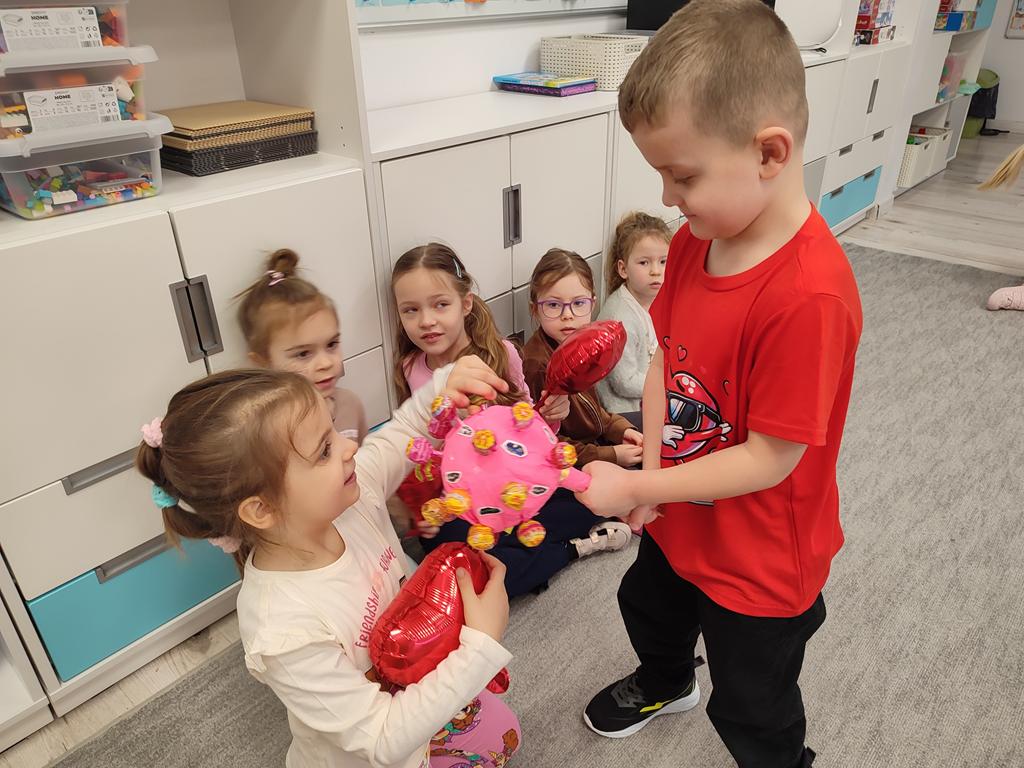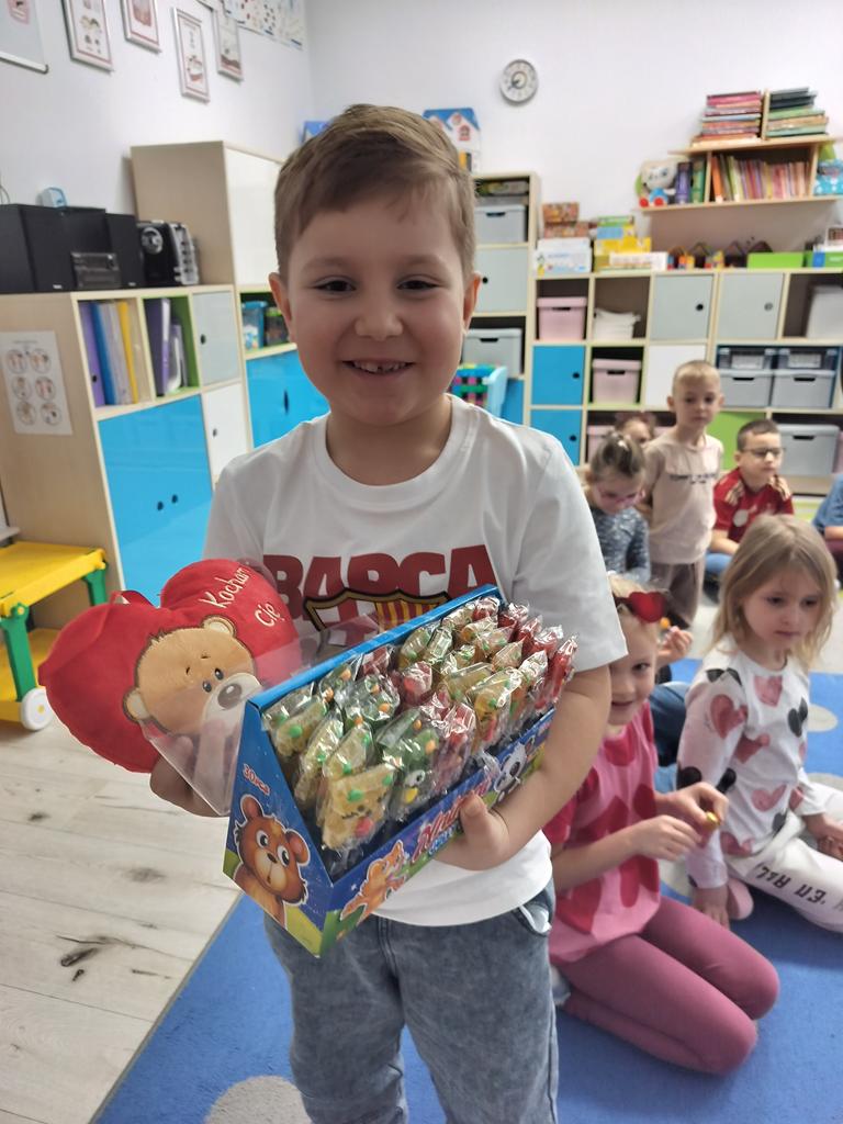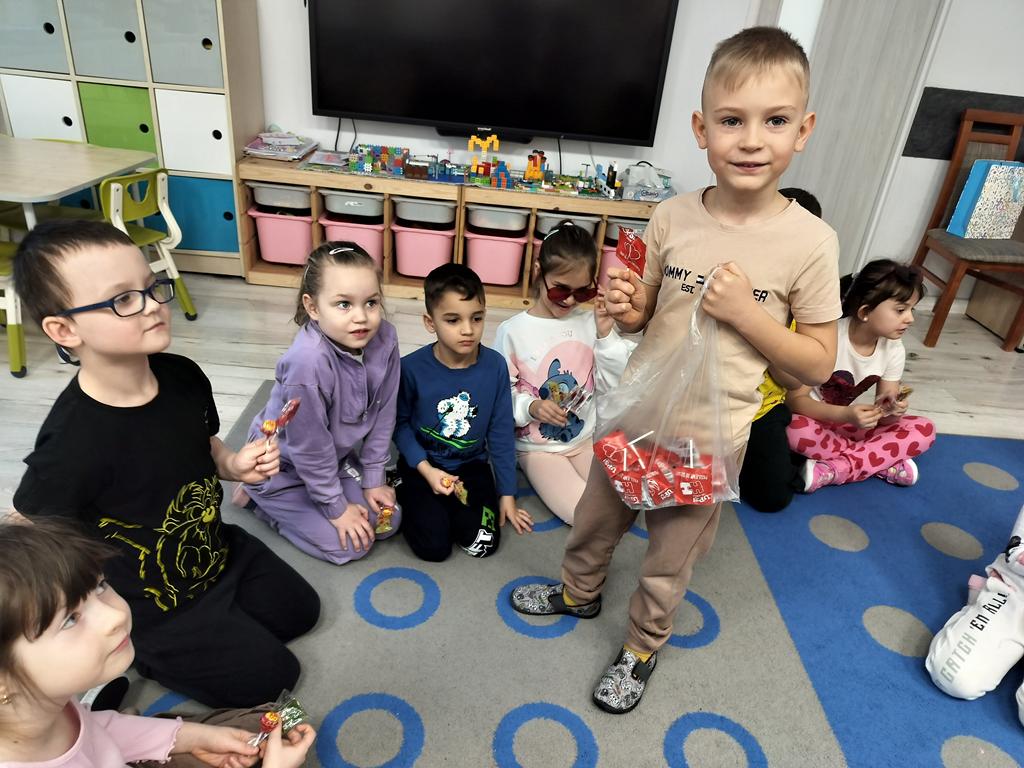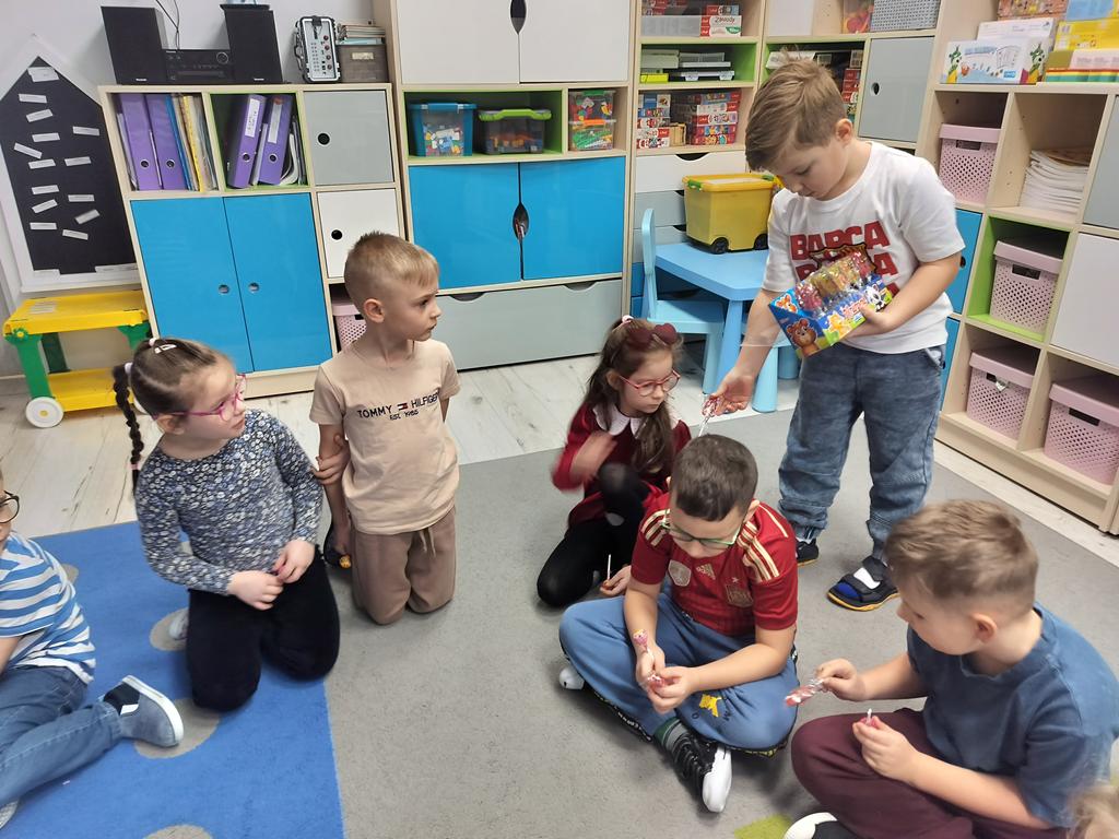 Dzieci mówiły sobie miłe słowa, uczyły się okazywać sympatię i przyjaźń. Wspólnie bawiliśmy się i świętowaliśmy przy słodkim poczęstunku. Były lizaki i inne słodkości, które sprawiły wszystkim dużo radości. 🍭🍬