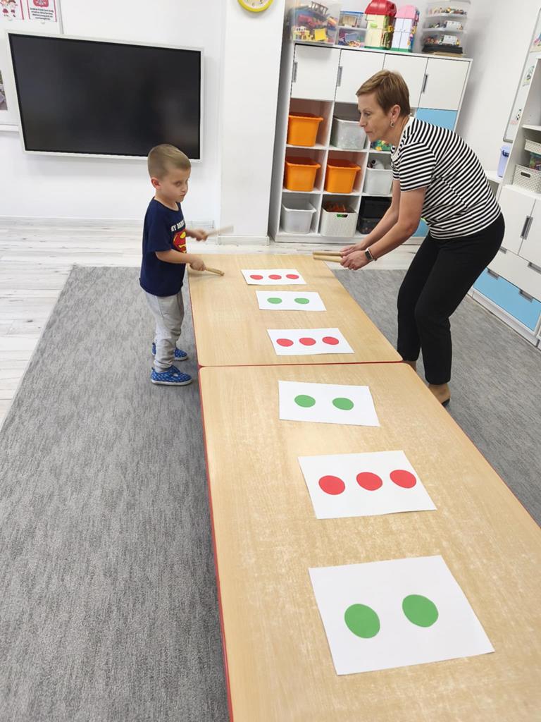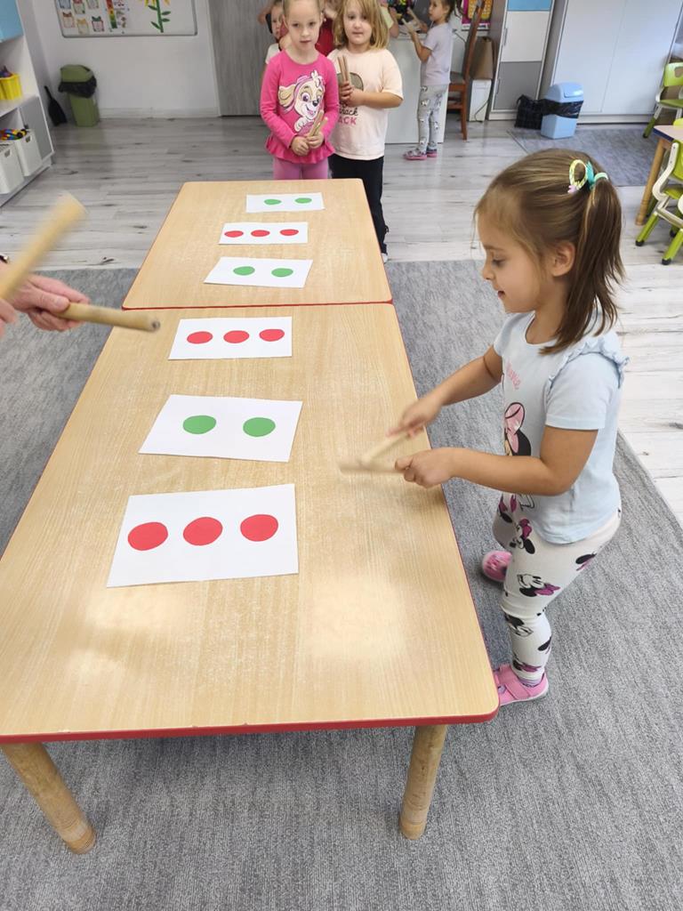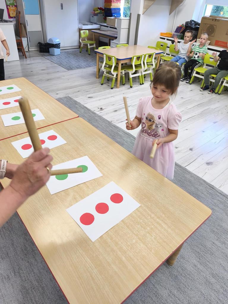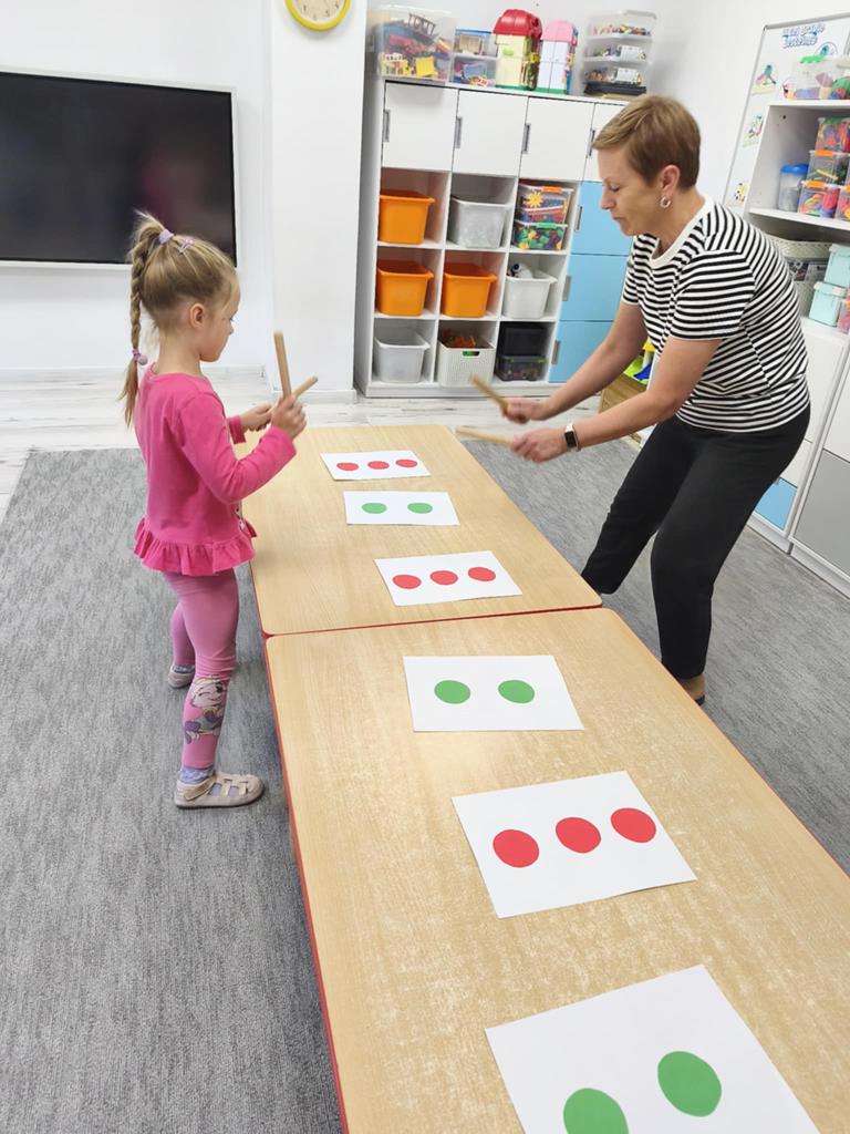 Podczas kontynuacji zajęć w grupie Żółtej rozwijając ćwiczenia oddechowe i fonacyjne (zabawy głosem), wprowadzamy elementy rytmiki (marsz, klaskanie, grę na instrumentach), a także zabawy artykulacyjne z rytmem. Grupa powtarza sylaby i wyrazy w różnym tempie, reaguje ruchem na muzykę oraz improwizuje krótkie rytmy. Połączenie ruchu, muzyki i mowy w formie krótkich, dynamicznych gier i piosenek, wspierają rozwój mowy, słuchu i koordynacji.