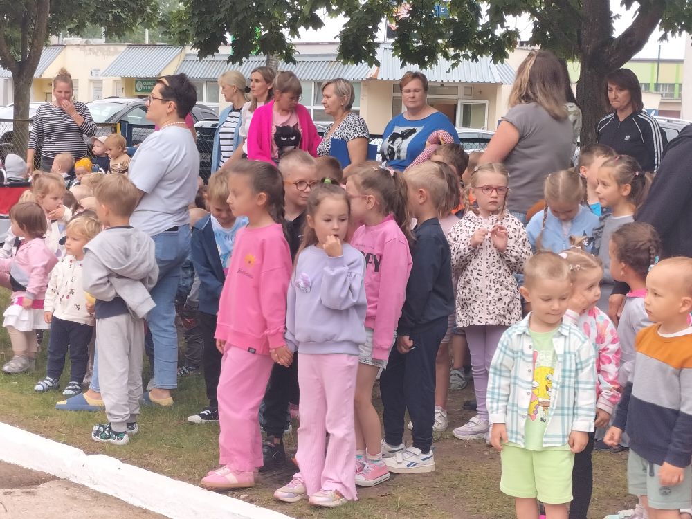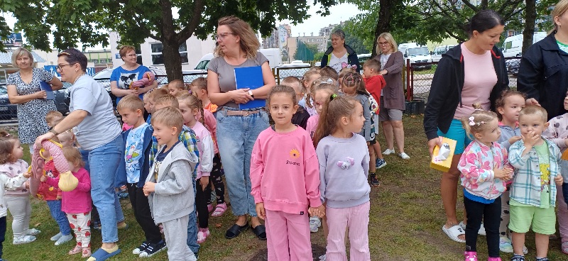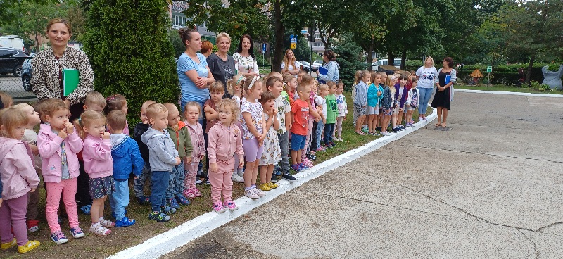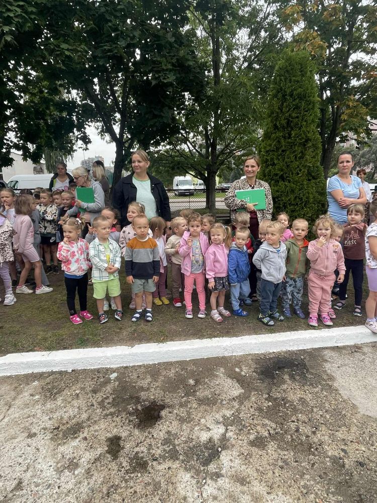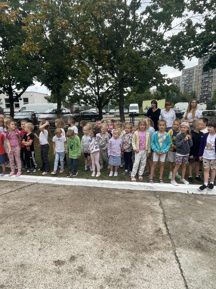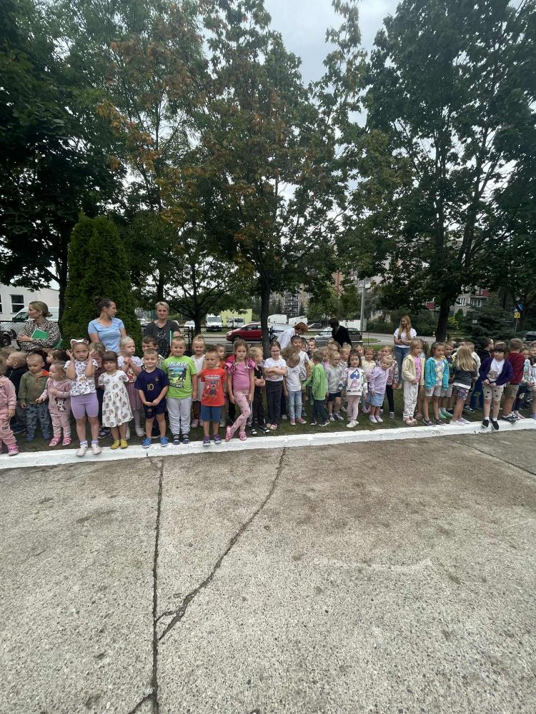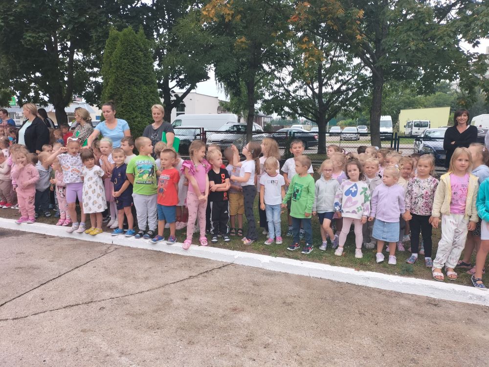 Dzieci pod opieką nauczycieli szybko opuściły budynek, kierując się do wyznaczonego miejsca zbiórki. Wszystkie grupy spisały się wzorowo – brawo dla naszych dzielnych przedszkolaków!