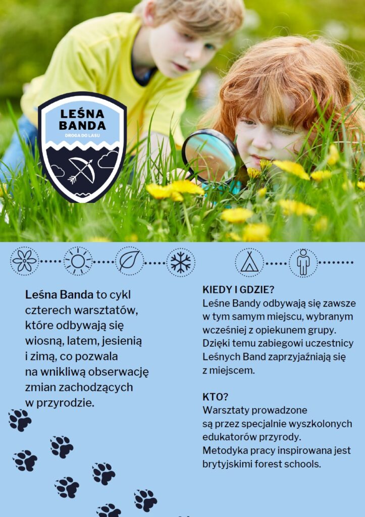 Założenia projektu: Leśna Banda to cykl 4 spotkań w przyrodzie, podczas których dzieci pod opieką wychowawców biorą udział w warsztatach przyrodniczo-surwiwalowych, prowadzonych przez trenera Leśnej Bandy i zawsze odbywają się w tym samym miejscu. Dzieci na Leśnych Bandach uczą się rozpalać ogień, rozpoznawać rośliny, zwierzęta i ich ślady. Dowiadują się jak zbudować schronienie, jak bezpiecznie pracować z nożem czy piłą do drewna, świetnie się przy tym bawiąc
